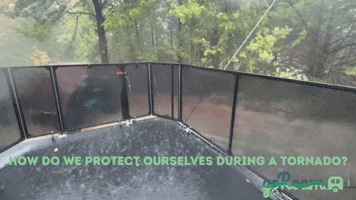 If you are in eminent danger of a tornado passing over your RV, exit the vehicle and get to the lowest ground around you like a ditch or dipin the land and lay down, protecting your head with your arms until the storm passes.